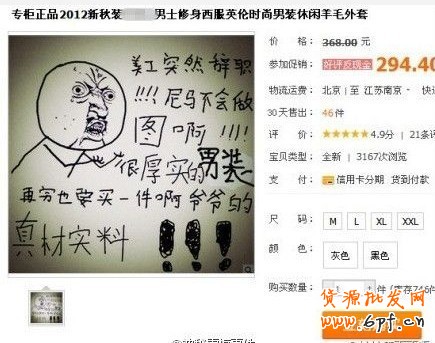 去年11月,因某網(wǎng)友在逛一家淘寶店時截圖并分享店內(nèi)搞怪圖片發(fā)在微博上,自此,一張?zhí)詫毜曛饔H自操刀的“暴走”宣傳畫便出其不意賣起萌走紅微博。店鋪賣的是“修身英倫時尚西服”,圖上畫的卻是一個面目猙獰的胖腦袋,旁邊歪歪扭扭寫著:“美工突然辭職!不會作圖啊!很厚實的男裝,再窮也要買一件!真材實料!”這張看來是拙品的畫作讓眾多網(wǎng)友捧腹,引來圍觀調(diào)侃,買家紛紛留言表示“店主太歡樂了,這是在賣西服么”“不知道衣服長什么樣感覺很刺激,300元買一份驚喜”。淘寶店也由此銷量暴增。