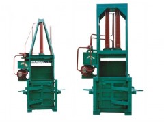 液壓打包機(jī)包括支架,支架帶有底板和前后側(cè)擋板,支架上安裝有千斤頂,千斤頂帶有活塞桿,活塞桿右端連接有豎直的推料板,推料板右側(cè)面連接有推料板條,相鄰?fù)屏习鍡l之間的空隙為板上穿繩槽;支架上面右部帶有壓料上擋板,壓料上擋板左側(cè)的支架上面帶有進(jìn)料口;前后側(cè)擋板右側(cè)的支架上分別固定連接有前后側(cè)擋條,相鄰側(cè)擋條之間的空隙為穿繩口;支架右端帶有出料口,出料口處的支架右端鉸接有門板,門板左側(cè)面連接有門板條,相鄰門板條之間的空隙為門上穿繩槽;前后側(cè)擋板、推料板和底板圍成的空腔為進(jìn)料腔,前后側(cè)擋條、壓料上擋板、門板和底板圍成的空腔為擠料腔;門板和支架右端固定連接有鎖定裝置。并可根據(jù)需要在一定范圍內(nèi)調(diào)節(jié)打包的大小。
