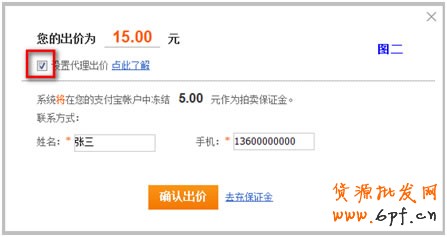 舉例:某拍品的起拍價(jià)為1元,加價(jià)幅度為6元,買家A設(shè)置的代理出價(jià)價(jià)格為15元(如圖一的競(jìng)拍價(jià)格),并在彈出的新窗口頁(yè)面勾選"設(shè)置代理出價(jià)"(如圖二),則此次A的出價(jià)金額為1元并設(shè)置代理出價(jià)成功,拍品當(dāng)前價(jià)格為1元。