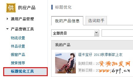 首先登陸阿里巴巴賬戶,在“供應產品”里,單擊“產品營銷工具”下的“標題優化工具”。