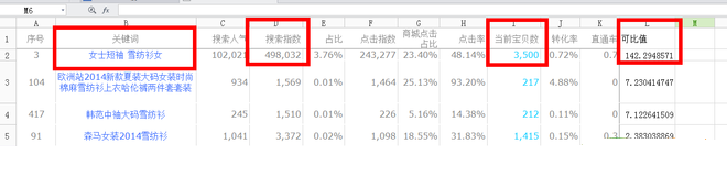 在表格右邊增加一個維度,簡單一點就叫可比值,比值=搜索指數除以寶貝數量。比值越高,越可能是藍海關鍵詞。