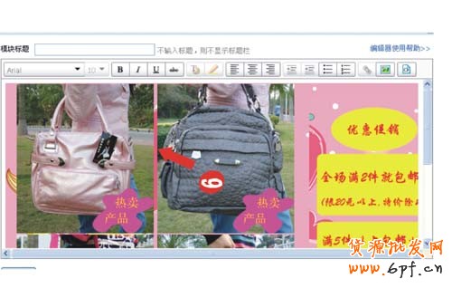 ![]() ![]() ![]() 第四步,背景圖片插入好了,我們就可以把要宣傳店鋪里的寶貝圖片復制,然后粘貼上來,效果如下: