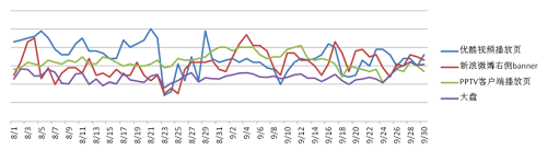 從圖中可看出,以上三個媒體點擊率(CTR)均高于站外大盤均值水平,優(yōu)酷和新浪微博的流量資源同比也更加明顯。
