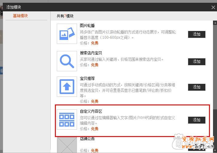 第二步:在右下方點(diǎn)擊“添加模塊”——“基礎(chǔ)模塊”——“自定義內(nèi)容區(qū)”,如圖所示:
