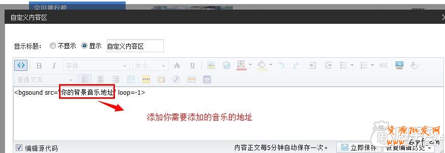 第三步:“自定義內(nèi)容區(qū)”添加好之后,選中“自定義內(nèi)容區(qū)”然后選擇“編輯”,選擇插入圖片,圖片插入好之后,再點(diǎn)擊“源碼”按鈕,接著在源碼結(jié)尾處添加好代碼:<bgsound src="你的背景音樂地址" loop=-1>