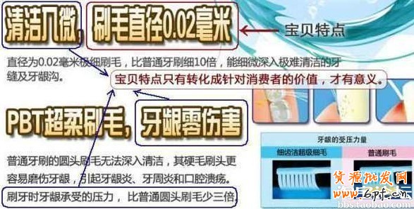 在這個寶貝描述中,刷毛直徑0.02mm是產(chǎn)品特點(diǎn),而牙齦零傷害就是對價值的提煉了。