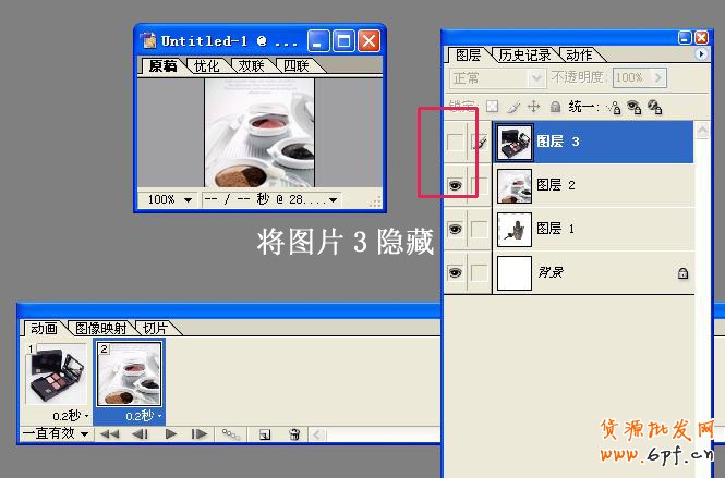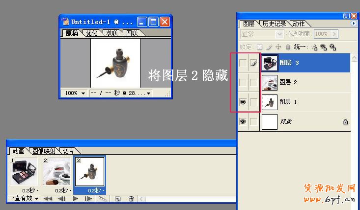 重復(fù)第六步,再新建一個(gè)禎,再隱藏第二個(gè)圖層。這樣,三個(gè)動(dòng)畫,三個(gè)圖片,都在動(dòng)畫工具欄中出現(xiàn)了。如圖