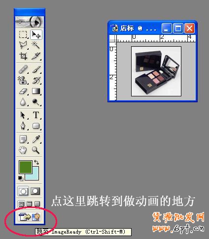 第五步:要做動(dòng)畫了,點(diǎn)擊指定的工具,跳轉(zhuǎn)到做動(dòng)畫的ImageReady軟件里。如圖: