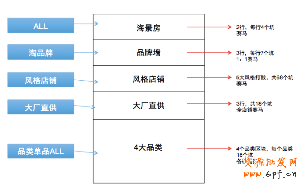 其中海景房分為兩行,每行有4個(gè)坑位,所有參會(huì)商品都可以在這部分進(jìn)行展示,但需要根據(jù)銷量進(jìn)行賽馬。而品牌墻則集中展示淘品牌,分為3行,每行7個(gè)坑位。風(fēng)格店鋪部分集中展示風(fēng)格店鋪,共分為5大風(fēng)格,但將全部打散,一共有68坑位。大廠直供也分為3層,一共18個(gè)坑位。4大品類這部分則分為4個(gè)區(qū)域,每個(gè)區(qū)域18個(gè)坑位。