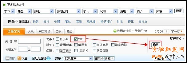 進(jìn)入淘寶首頁(yè),然后點(diǎn)開要看的類目,(比如衣服,比如鞋...)然后會(huì)看到在更多篩先條件和衣服的中間,你會(huì)看到一點(diǎn)綠色的VIP三個(gè)小字,點(diǎn)前面的白框即可。