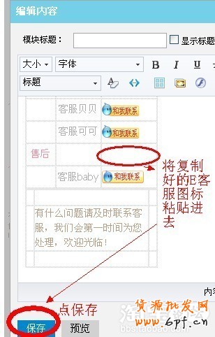 1選擇方格—2填寫文字信息—3選擇E客服分流與否—4生成網(wǎng)頁代碼—5復(fù)制E客服旺旺圖標(biāo)—6粘貼到我的店鋪模塊中發(fā)布即可。如下圖:“