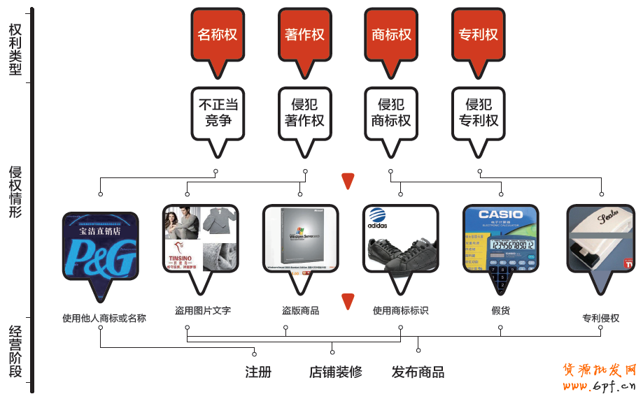 由于很多賣家對知識產(chǎn)權(quán)的意識不夠,以及對知識產(chǎn)權(quán)的不熟悉,導(dǎo)致走向敏感地帶,使得自己在前進(jìn)的路途中碰到一些壁壘。比如在你的店鋪名注冊上,或店鋪的基礎(chǔ)店鋪裝修,寶貝發(fā)布等環(huán)節(jié)都有涉及。以下則為淘寶網(wǎng)上常見的六種知識產(chǎn)權(quán)侵權(quán)類型。