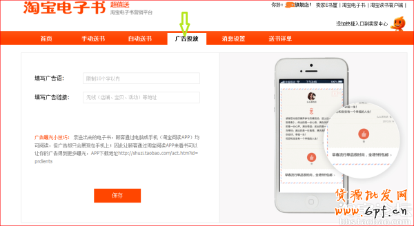 1、電子書超值送的簽約賣家,點擊后臺的“廣告投放”(投放地址http://songshu8.taobao.com/activity/ad_text_url.htm)
