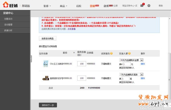 商品限制:一款寶貝只能參加一個在線試用活動,一個活動最多允許設置12個試用品。