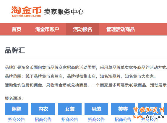 賣家以店鋪為單位報名的活動方式,各會場都設置了若干品牌坑位,每個店鋪至少提交10款報名商品。品牌匯在淘金幣首頁及各會場頁均享受置頂,單品牌成交額目標:100萬