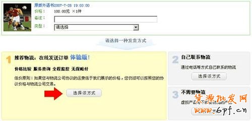 頁面的下半部分是三種選擇方式:推薦物流、自己聯系物流和不需要物流。首先以推薦物流為例,看看它的發貨過程。當你的鼠標移動到推薦物流區域,此區域變成亮黃色,點擊這個區域中的“選擇該方式”按鈕(如下圖)