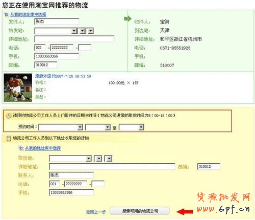 你需要在綠色區域核對你的發貨地址和買家的地址,然后在黃色區域預約物流公司的上門取貨時間。最后再核對物流的上門取貨地址,核對無誤后,請點擊“搜索可用的物流公司”,系統會根據你的發貨、取貨地址和預約時間,搜索出相應的物流公司。