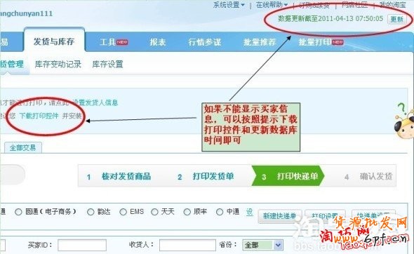 最后一點,如果買家信息不能及時出現,或者不能打印,請按照圖中指示的兩處進行更新,下載打印控件,或者更新數據庫時間,下載并安裝控件之后,一般點擊更新數據庫時間就可以從容打印快遞單了,還有就是如果長時間操作打印不更新數據庫時間,也會有買家數據信息更新不到位,經常同步更新下時間效果更好。