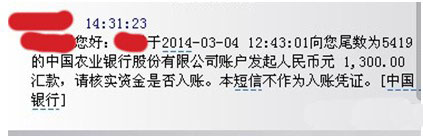 其實(shí),到了這一步,掌柜已經(jīng)掉入了騙子的圈套。不到一會(huì)兒,掌柜就會(huì)收到一條入賬的短信。內(nèi)容大概如下: