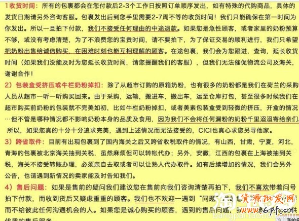 糾紛退款率會直接影響店鋪搜索排名,哪怕是買家無理由退款掛著總也不好看,為了盡量避免這個問題,寶貝詳情描述和售前提示都會特意提到直郵代購比較特殊的地方:到貨時間和潛在的跨省抽稅,這往往是國際代購產生退款和糾紛所在。由于下單之前顧客了解比較充分,下單之后疑問也會相對減少,消費體驗得到了進一步提升,順理成章地贏得了良好的口碑和更多的成交機會。
