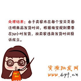 (如果店鋪放假,在節假日內必須每個寶貝都注明發貨時間,非節假日,建議下架),若只在店鋪公告,主圖,簽名等注明,違背發貨時間承諾成立。賣家未按照淘寶規定的72小時發貨或者是未按照與買家約定的發貨時間發貨而被投訴的,商家可以在小二未處理前做好賠付(交易金額的5%,不超過30元)或者和買家協商撤銷,避免違規扣分。