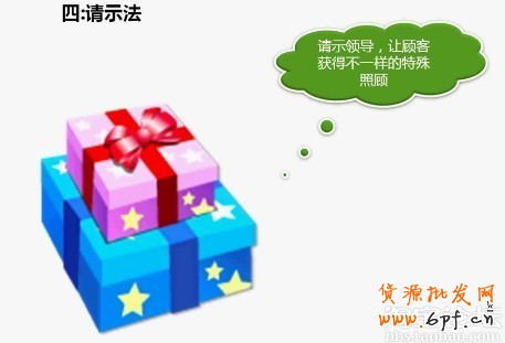 這個請示法是有一點假裝的含義,其實我們店鋪里多少都會準備些小贈品或優惠券什么的,但是我們通過這樣的轉訴,讓顧客感覺到她獲得的是不一樣的待遇,也是把這個討價還價的目標人轉移走了。也是有一位顧客想讓產品價格少些,我們先是說了;親這已經是特價的嘍,不過我們可以跟倉庫妹妹溝通下讓她放點小贈品表示下我們的心意,好嗎?這不是人人都有的哦。這時候她有了一個特殊待遇,但顧客還是跟我們糾結在價格上,這時我們可以說;好吧我申請了領導送您一張優惠券,是限量的哦。這時顧客又享有了優惠券的待遇。這兩點都是客服看是不能主動給顧客的,都是利用了同事關系或是請示了領導才獲得了這樣的機會,讓顧客感覺到所享的是特殊的待遇。這時顧客也就不會再與我們糾結了,因為她獲得了贈品獲得了優惠券,也獲得了心里的滿足感。這樣的顧客也會開心的下單的。