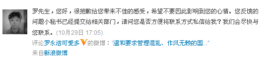 時(shí)刻5:2012年10月30日,@國(guó)航小秘書在羅永浩投訴微博下再次評(píng)論留言: