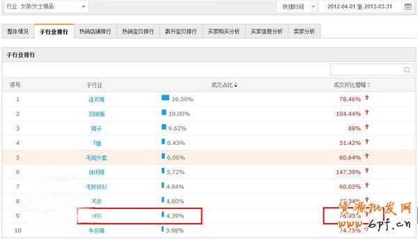從淘寶女裝類目的排名情況來看,女裝下的第一大類目連衣裙排名第一,競爭肯定很激烈。4月開始就很快進入夏天的旺季,結合數據可以發現,襯衫是比較靠后的,但是成交環比是在增長的,相對競爭沒有連衣裙那么激烈。