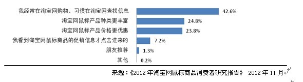 從上面圖5可知,消費者選擇來淘寶網購買鼠標商品,有69.5%主要是因為“已經習慣在淘寶購物”,其次才是“商品價格更優惠”以及“更方便貨比三家”。
