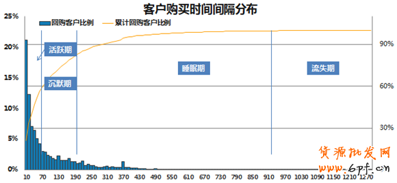 圖表1:客戶購買時間間隔分布(數(shù)據(jù)已部分處理)