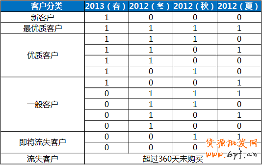 X首先劃分了明確的季節(jié),采用了農(nóng)歷劃分方法,這樣更體現(xiàn)氣候特點。然后根據(jù)客戶是否在各個季節(jié)購買過商品,對客戶進行分組。如春夏秋冬都購買過的客人,就將其劃分至最優(yōu)質(zhì)客戶組,超過兩個季節(jié)未購買的客戶劃分至即將流失客戶組。這樣的劃分使得X對客戶管理即可從兩手抓,第一“手”即把新客戶轉(zhuǎn)化為回頭客,逐漸培養(yǎng)為優(yōu)質(zhì)客戶,另一手即盡量減少客戶流失,以最小的成本挽回客戶。