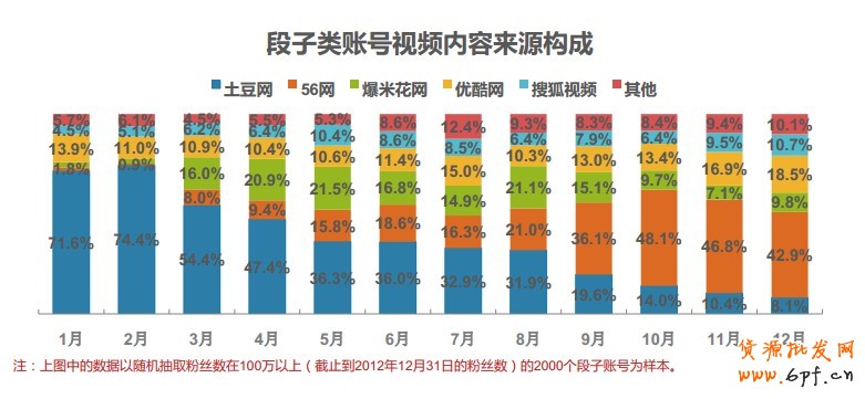 還有一個數(shù)據(jù)值得關(guān)注:微博很多段子類賬號的視頻內(nèi)容來源。以視頻網(wǎng)站為例,優(yōu)酷土豆所占據(jù)的份額由年初的85.5%下降為年底的26.6%,如此看來,合并非但沒能給優(yōu)酷土豆在段子類賬號的視頻博文中帶來更高的份額,反而下降了。與此同時,強(qiáng)調(diào)Video與SNS相結(jié)合的56網(wǎng)則不斷飆升,從1月的1.8%不斷攀升至12月的42.9%,成為新浪微博上以內(nèi)容稱雄的“視頻之王”。