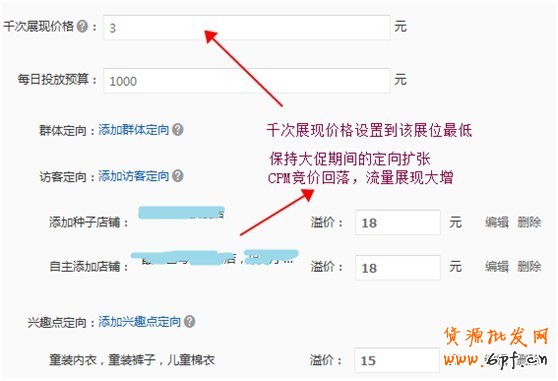 2、 千次展現價格低(設置到該展位最低),溢價高(如果出現通投流量繼續提高溢價,或者擴張定向設置)