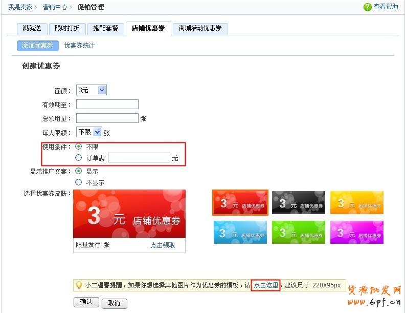 創建優惠券頁面設置比較簡答,唯一需要提醒各位商家的是,優惠券的各種使用條件要設置清楚,建議優惠券的使用期限不要超過一個月,讓買家盡早回頭。優惠券的使用條件要根據自己店鋪的實際情況進行設置,參考店鋪客單價、商品平均單價。