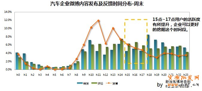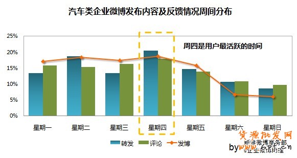 周四用戶反映熱烈:汽車企業(yè)微博在周四的反饋效果顯著高于每周其他時(shí)間段。