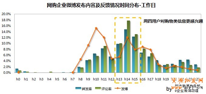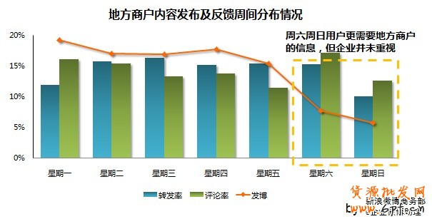 周三、周四互動(dòng)最集中:用戶進(jìn)入一周的穩(wěn)定期,對(duì)于微博的反饋積極性有明顯的提高。但是企業(yè)目前對(duì)于這兩天的利用不足,發(fā)博比例偏低。