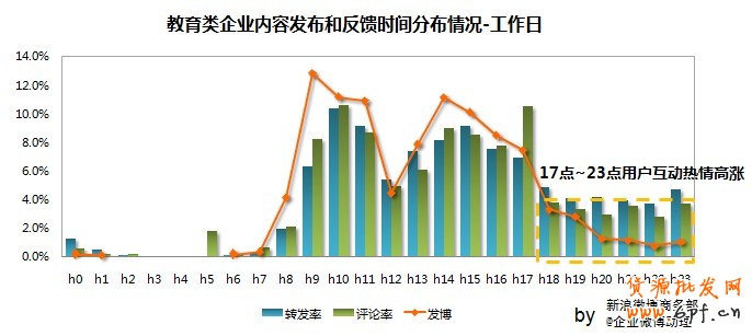 17點(diǎn)~23點(diǎn)用戶互動(dòng)強(qiáng)烈:17點(diǎn)之后教育類微博的受眾放學(xué)或下班,有比較強(qiáng)烈的互動(dòng)欲望。但企業(yè)卻較少發(fā)布內(nèi)容,這段時(shí)間需重點(diǎn)利用。