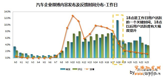 18點(diǎn)以后進(jìn)入用戶反饋高峰期:自下午18點(diǎn)后,汽車企業(yè)的發(fā)博量逐漸減少,而此時(shí)用戶的互動(dòng)積極性正進(jìn)入一天的高峰期。企業(yè)需要將上午的發(fā)博量調(diào)整到下午及晚間。