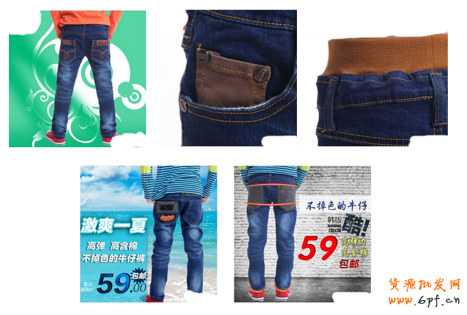 我們看下圖上標注了打字:搶瘋了真的只要49元,然后小字:休閑、百搭、舒適女童純色七分褲。文字突出可價格,突出了褲子很搶手,然后小字追加了一些褲子的特點詞,這里我們可以感受到賣家的產品表達的聲音就是性價比高,不買就沒了的聲音,在文字的策劃上去表達買家心里需要的。另外在顏色搭配上,把重點的文字和顏色和底色衣服協調的搭配在一起。更大促成點擊和成交轉化目的。集市賣家可以完全做出這樣的圖做第一張圖當成引流圖來操作。好了介紹完這兩個位置,我們就還有3個位置了。