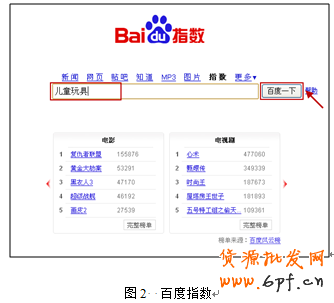 現在就打開【百度指數】首頁,在搜索欄中,輸入你網站的主要目標關鍵詞“兒童玩具”,如圖2所示,單擊“百度一下”按鈕。