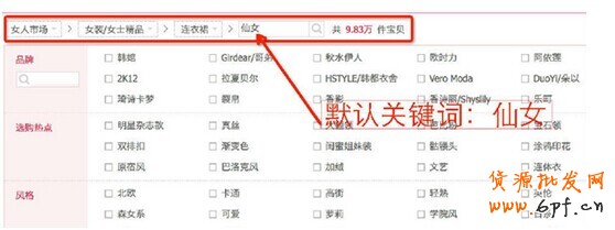 此時,我們就會看到,淘寶默認的關鍵詞是“仙女”的,一共有9.83萬件寶貝。接著我們再看看頁面下,仙女關鍵詞搜索出來的默認內容。