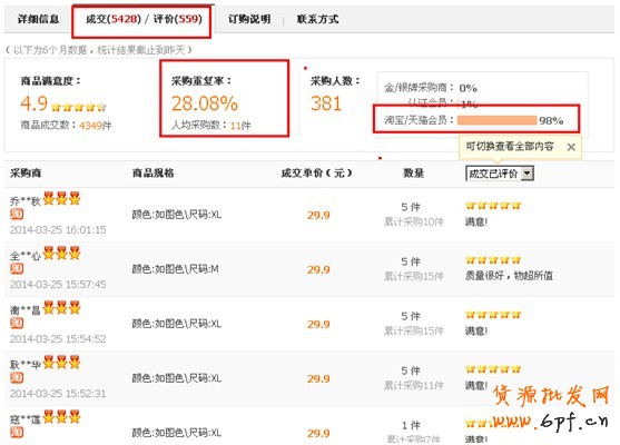 通過上圖顯示,可以看出來該店的銷量大部分是來自天貓和淘寶賣家的,總共有381人在他這里拿貨,重復采購率是28%,有100多人有重復購買。重復采購率越高,就證明貨源的質量跟市場反饋越好!此外,還可以看每個人累計的采購件數,如消費品賣的越火證明市場接受度越高,如果找沒有銷量數據的產品代銷,就要自己去實踐之后才知道產品好不好賣,這樣的代價直接就是你的運營成本跟時間的增加,顯然是不劃算的。