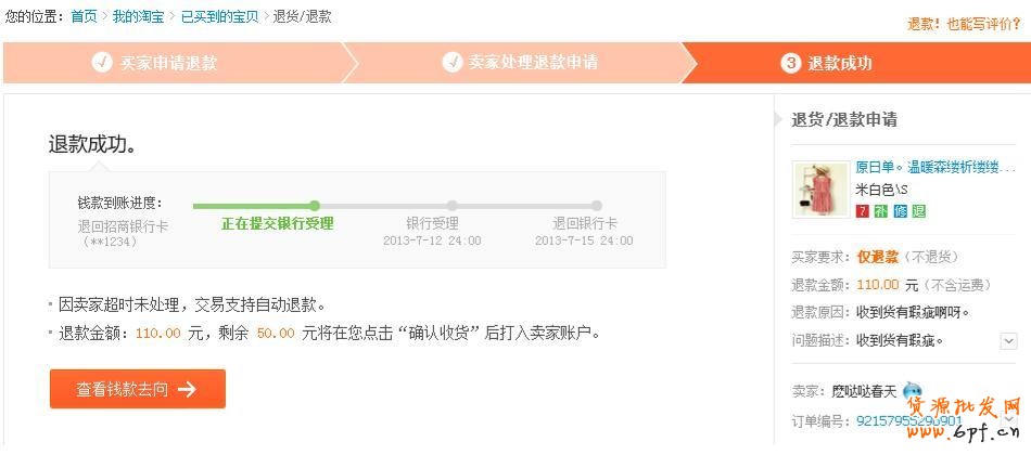 4、 僅退款狀態(tài)下,當(dāng)賣家選擇同意退款后,直接退款給買家。退款金額會退回到買家的支付工具中(支付寶OR銀行卡),買家可點(diǎn)擊“查看錢款去向”了解。