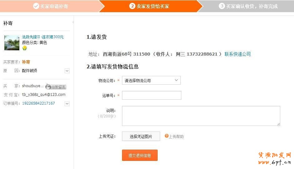 D、賣家同意申請后,填寫發(fā)貨信息。