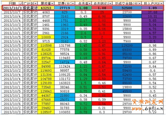 得出這些結果之后,依然用標色篩選法,進行自定義篩選,如:展現量>=10000,花費<=30000,點擊率>=0.5,點擊轉化率>=0.5,總成交金額>=30000,投入產出比>=1,標記好后,看一下結果: