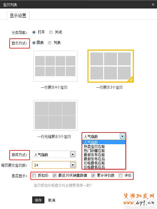 寶貝列表頁是分類的一個引流,引導顧客關注更多產品,雖然這個看似很簡單,里面也是暗藏小技巧的。現在顯示設置可分為顯示方式:圖表和列表(圖表可一行展示4個寶貝,一行展示3個寶貝,一行無縫展示3個寶貝),除此之外還可選擇排序方式、展示的寶貝數、以及是否顯示折扣價、最近30天銷售數據、累積評價數、評價,這個就需要我們如何根據自身產品情況而展示。此外,左側190px模塊盡量與寶貝右側展示的模塊對齊,這樣會顯得更加整齊美觀。