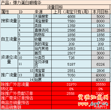 天貓搜索流量上個月是4668,這個流量來源屬于搜索流量,不具備爆發性特點,所以可以定在5000左右;直通車流量上個月是7050,其渠道屬于推廣渠道,有爆發的潛力,可以定高點,比如40000。以此類推,根據渠道的特點制定相應的流量目標,同時參照上月的轉化率,便可得到這部分流量可貢獻的訂單數量。