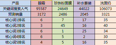 上圖是經過計算然后匹配出來的排名表,很明顯透過這張表格選出主推的款式眼霜。雖然它的搜索人氣沒有洗面奶高,但從各項綜合指標看,眼霜更容易爆。