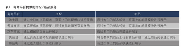 電商平臺(tái)以淘寶、天貓、京東為代表,資訊導(dǎo)購類平臺(tái)以美麗說、蘑菇街為代表,均嘗試提供針對(duì)性的功能或服務(wù),例如搭配、新品功能、活動(dòng)等,希望讓沒有明確商品目標(biāo)的女性消費(fèi)者逛得更爽,從而促進(jìn)購買。關(guān)于搭配和新品的情況,具體如表1所示。