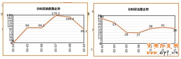 這兩張圖分別是在打底褲類目下轉化率排在前五位的寶貝的流量圖和銷量圖